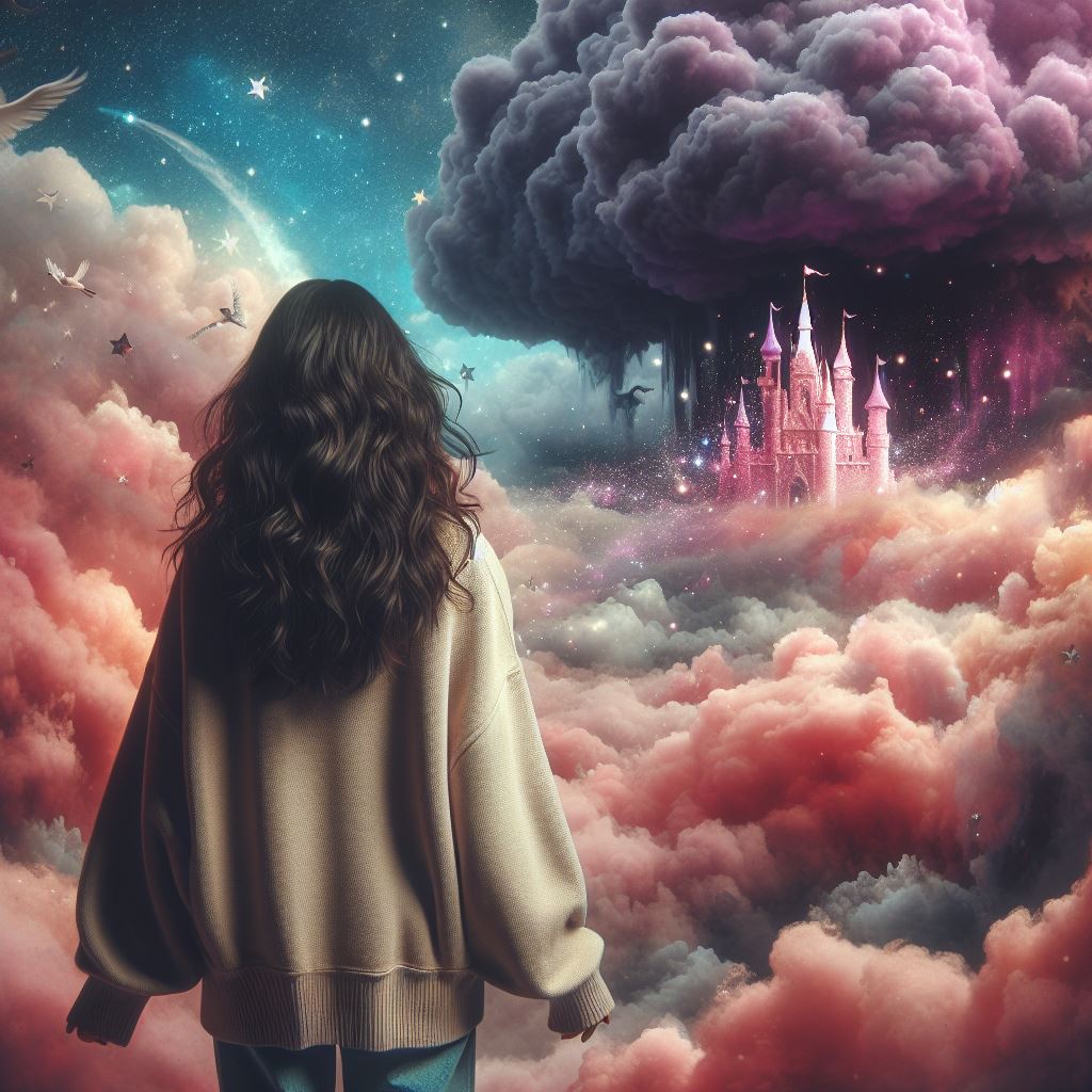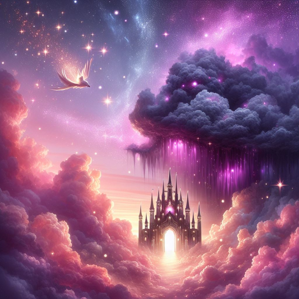 De pronto, llego a mi casa por el jardín. La rodeo, y automáticamente intento saltar como para elevarme en el aire, pero no puedo. Otra vez no puedo volar. Brinco una, dos, tres veces, y alcanzo a ver hacia el sureste una mezcla de nubes rosas y púrpuras de ensueño. En medio, parece haber una abertura con luz y veo un castillo que desprende destellos como glitter. No logro dar el siguiente brinco, pero quiero ir a ese lugar como si ahí fuera a estar al fin segura y como niño chiquito empiezo a orar. “Por favor, Señor, Señor, ayúdame, no puedo salir de aquí,”