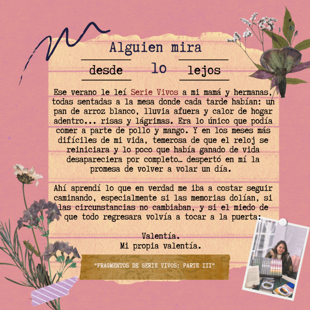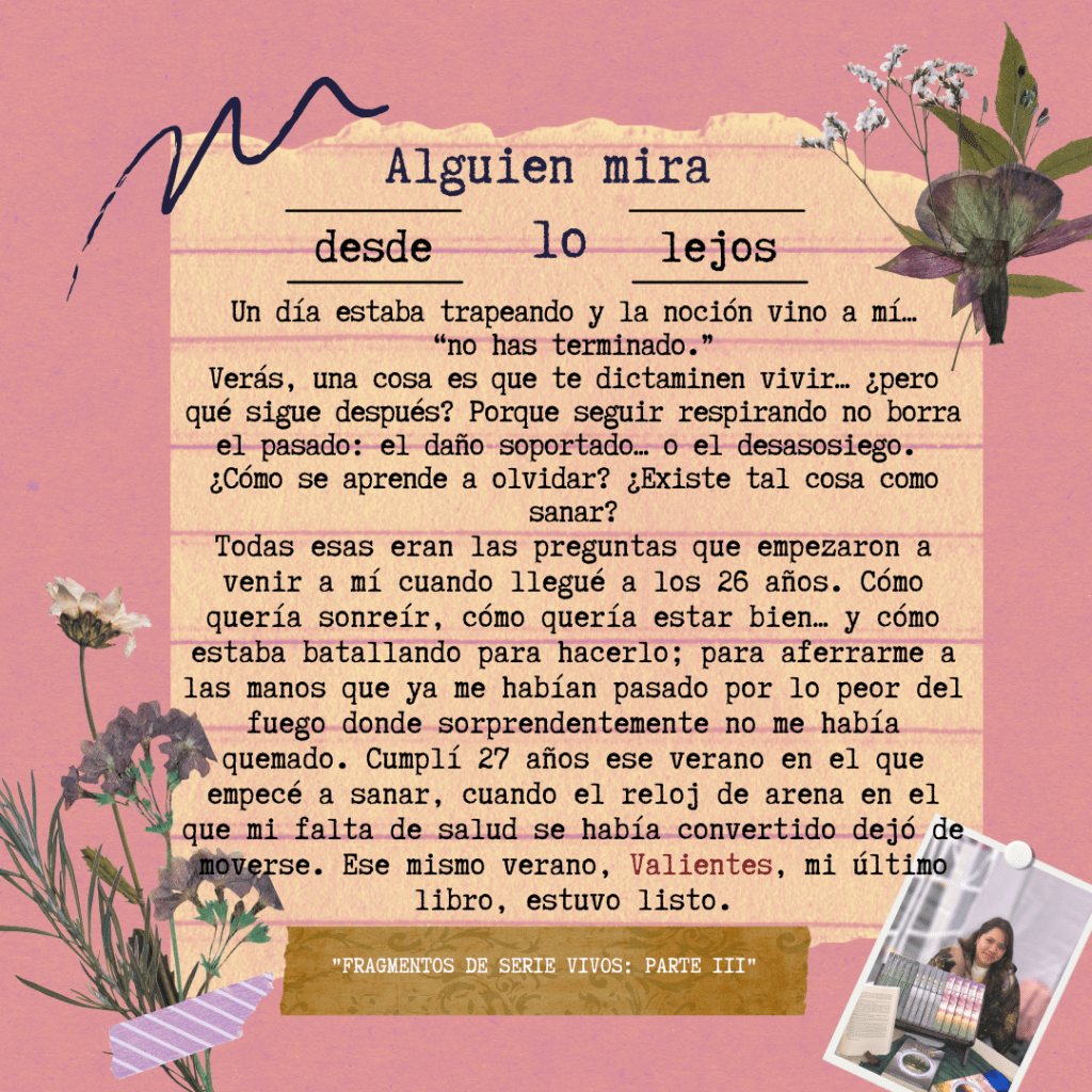 Inesperadamente, el primer personaje que escribí en mi vida, que terminó como una pieza clave para Serie Vivos, era todo lo que yo no quería ser… pero en lo que sentía que me estaba convirtiendo tras el dolor; el del inicio y el de después. En ese tiempo no sabía cuáles eran mis libros; sus nombres, el universo, los arcos, o que siquiera existirían realmente. Con todo, en ese tiempo, yo empecé una lucha alterna al morir o no, una llamada… cómo vivir. Por todo donde yo había visto golpes, se había generado una yo que no quería ser y que habló dentro de mí durante mucho tiempo; una joven desesperanzada, que llamaba tormentas y lluvia, desolación y dolor, todo donde tenía que haber habido espacio para sol, risas, y esperanza. Ella, contestaba cada que cualquier cosa pasaba, con un irreparable, ‘nada importa’, ‘da igual’, ‘un día no voy a estar’, ‘me es poca cosa’, ‘un día no me van a ver’, ‘cuando me pueda ir’, ‘cuando pueda escapar’, y toda cosa amarga que te puedas imaginar. En el hablar, quería ella también actuar, y ahí la lucha se hizo cotidiana, sobre hacer o no hacer cosas solamente porque no veía una real opción para hacer lo que fuera mejor.